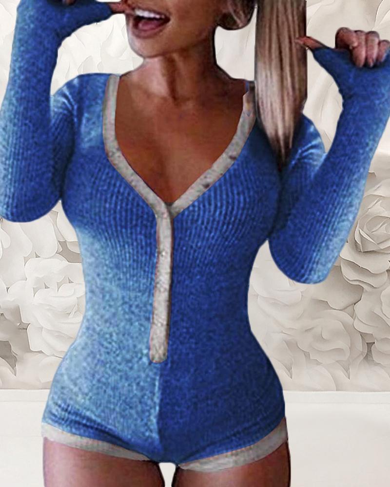 Contrast Binding V-neck Button Design Long Sleeve Romper, Blue