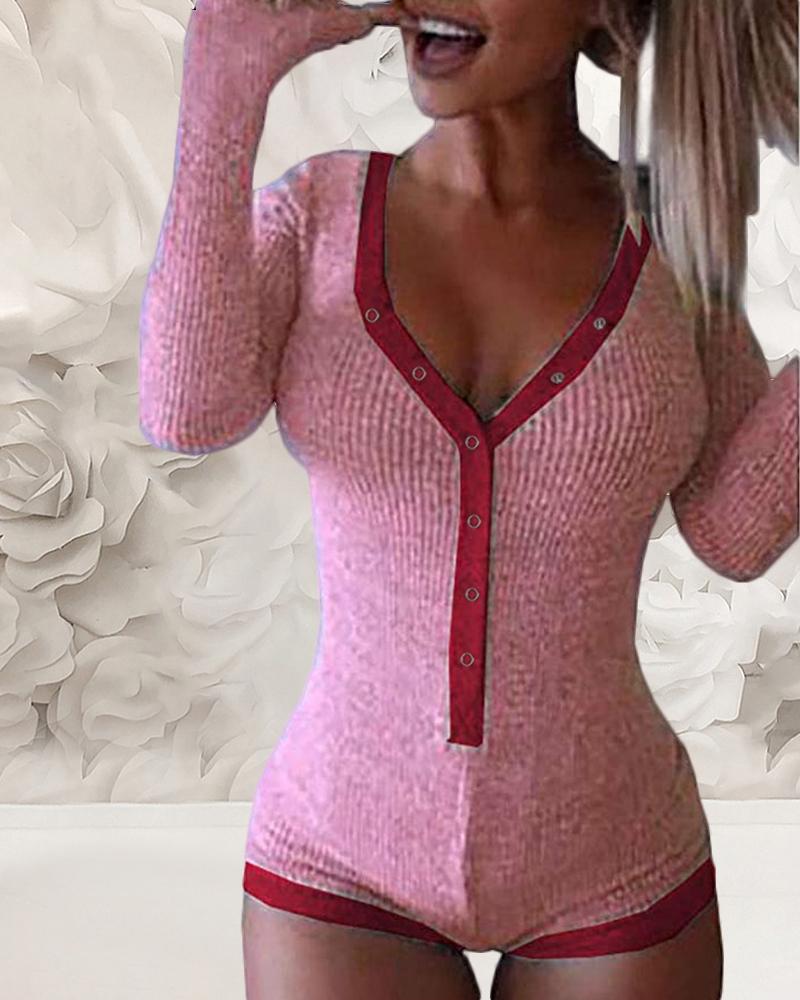 Contrast Binding V-neck Button Design Long Sleeve Romper, Pink