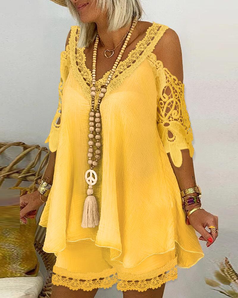Contrast Lace Cold Shoulder Flowy Top & Shorts Set, Yellow