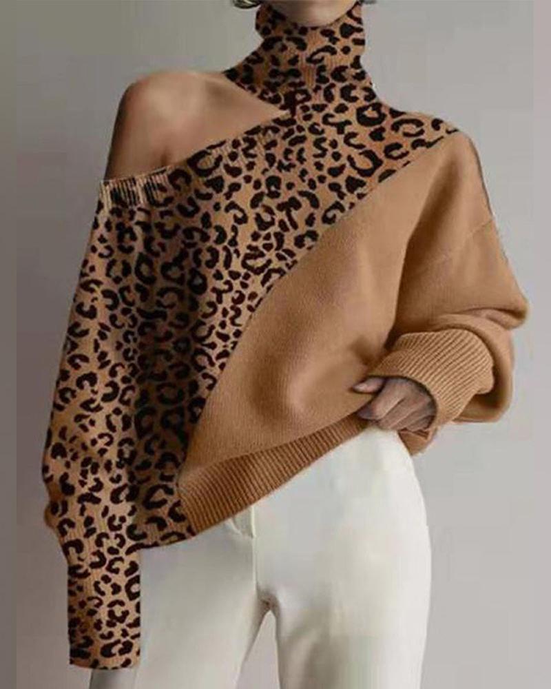 Contrast Leopard Cold Shoulder Sweater