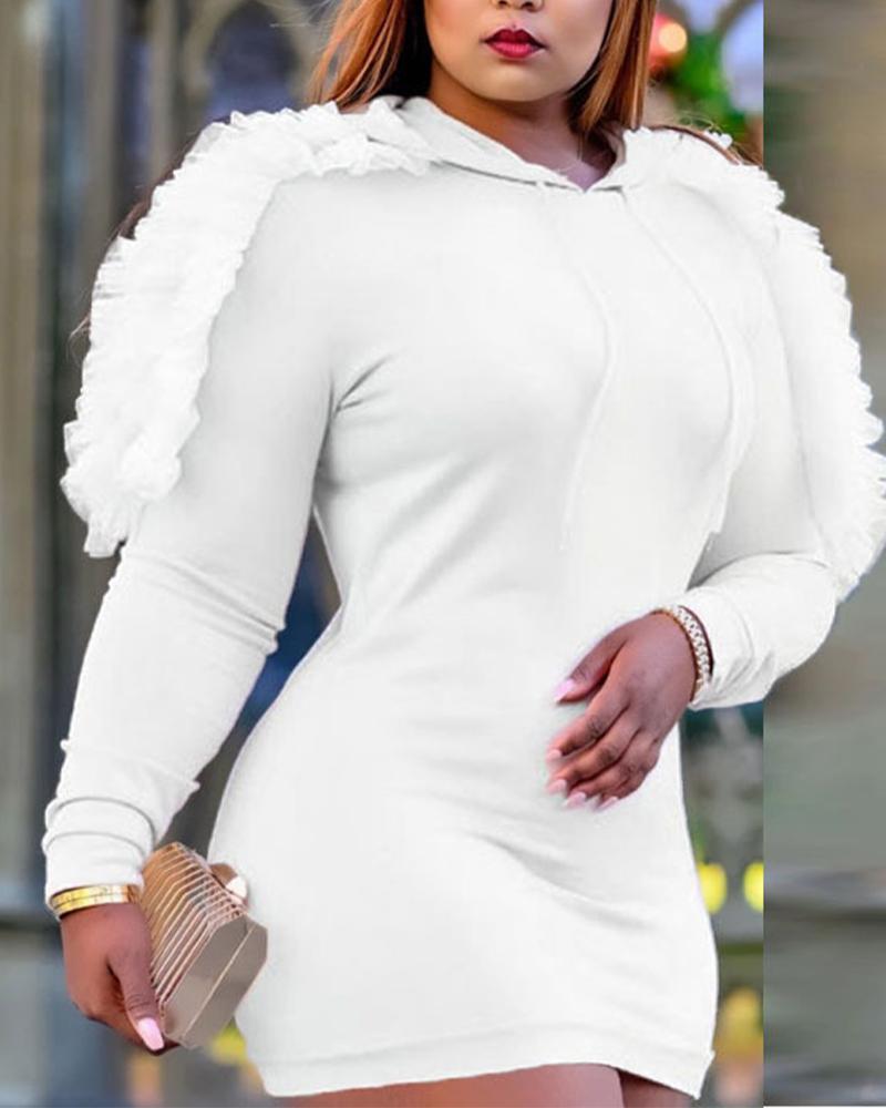 Contrast Mesh Drawstring Hooded Bodycon Sweatshirt Dress, White