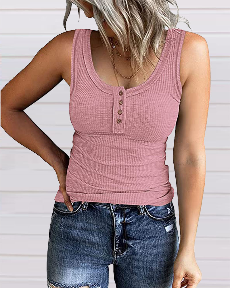 Contrast Stitching Button Front Ribbed Tank Top, Pink