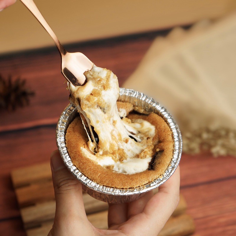 two dough cookies in a cup with dark choco chunks and marshmallows