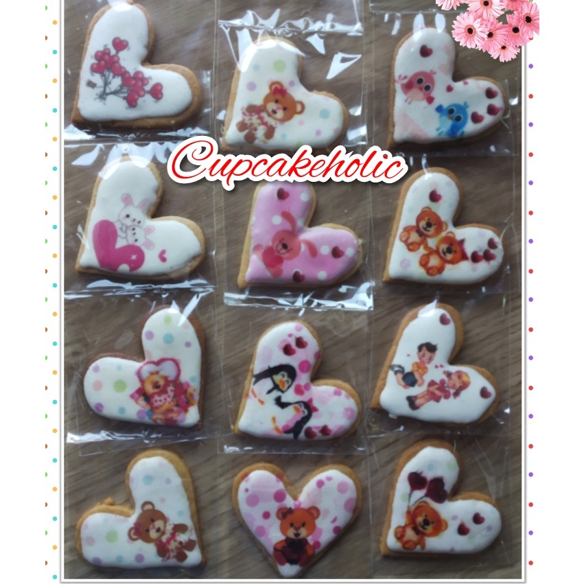 Cookies bentuk Hati di Icing dengan gula dan di printing gambar sesuai keinginan (custom)