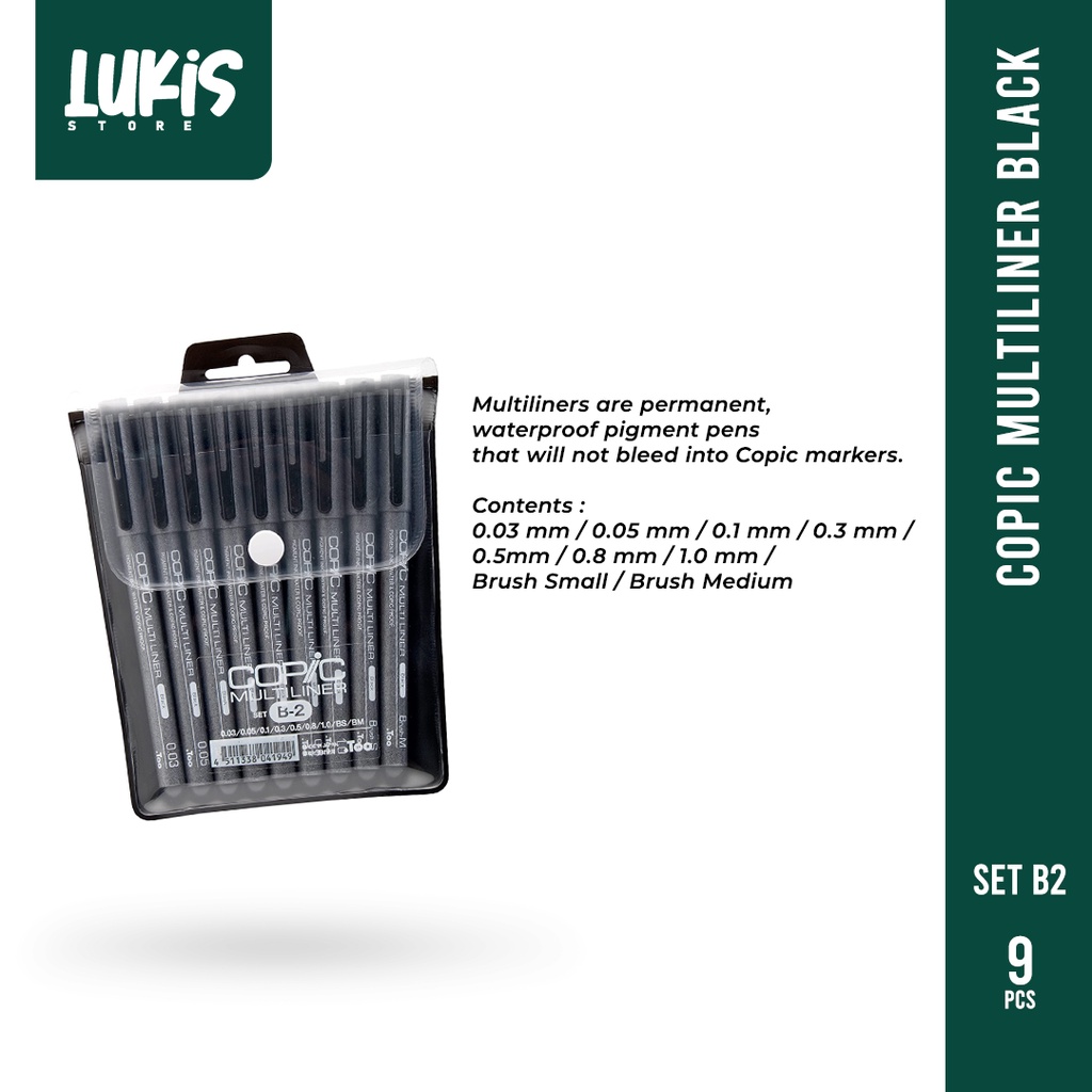 The popular original Multiliner inking pens are ideal for all of your fine-inking needs.Multiliners are permanent, waterproof pigment pens that will not bleed into Copic markers. These precision drawing pens are great for detailing, fine art, design, comics, illustrations, modeling, journaling, papercrafting and more.