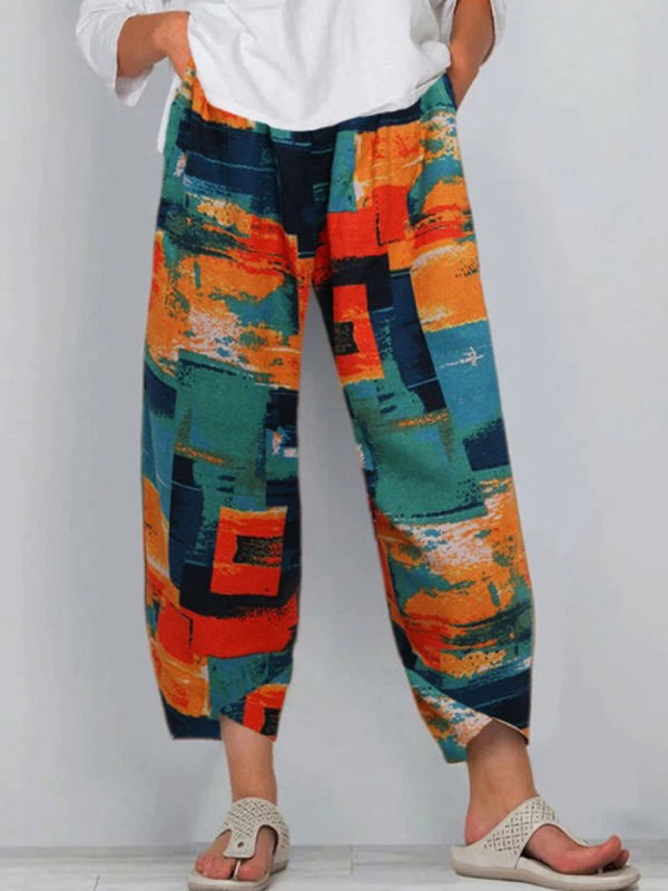 Cotton And Linen Printed Elastic Pants