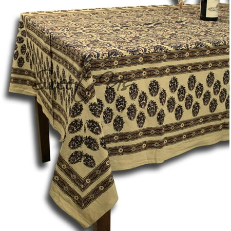 BEAUTIFUL FLORAL DESIGN:A beautiful tablecloth highlighting a spectacular hand block print floral design available in shades of gold red and blue on a beige background flaunted by a fascinating border 100% COTTON FABRIC:It is made of 100% cotton power-loom fabric which gives strong tighter & smooth weave for better durability EASY CARE:Color fast and machine wash separately in cold water Tumble Dry or Hang Dry PERFECT SIZE:Rectangular about 60 x 90 inches MULTIPLE USES:Restaurant / Wedding Parties / Formal Dining / Casual Dining / Special Occasion
