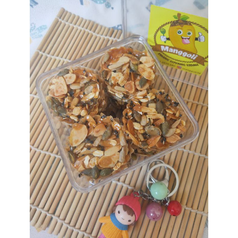 Cemilan sehat yang terbuat dari almond slice, sunflower seeds, pumpkin seeds, black sesame, dan rolled oats. yukkk yang doyan ngemil merapattt....