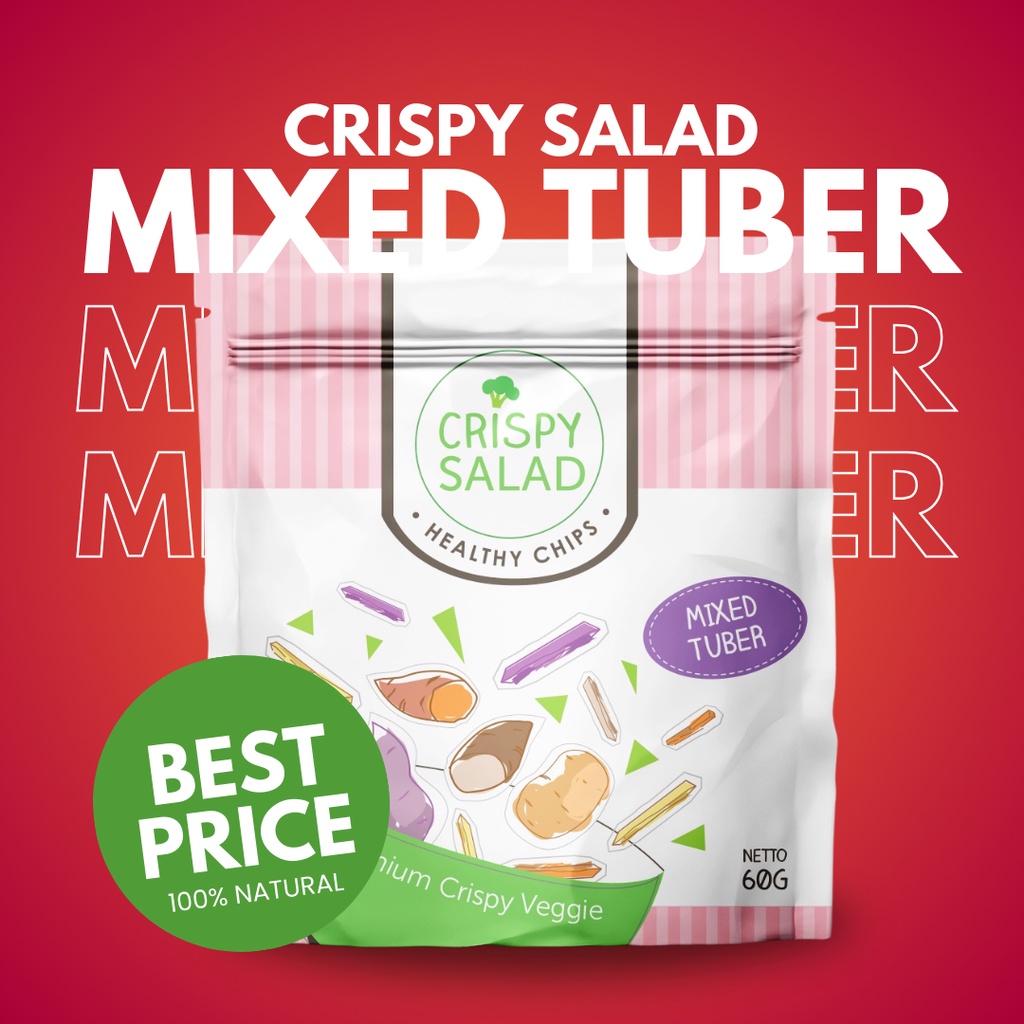Terbuat dari campuran ubi (merah, putih, ungu), kentang dan talas berkualitas terbaik, dengan rasa yang manis, renyah, creamy dan gurih, Crispy Salad Mixed Tuber disukai semua kalangan termasuk yang biasanya anti sayur sekalipun.