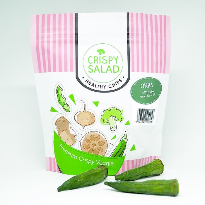 Setiap bungkus Crispy Salad Okra chips terbuat dari 170 gram okra segar atau setara dengan satu setengah porsi sayuran.