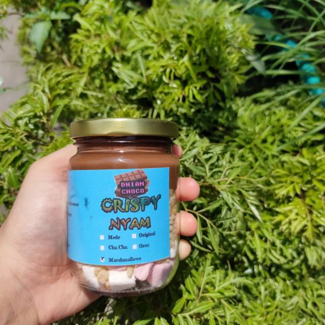 Crispynyam di sajikan di dalam jar kaca dengan coklat lumer dan crispy crispy yang renyah .