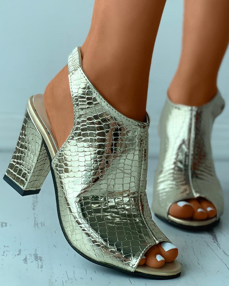 Croc Embossed Peep Toe Chunky Heels, Gold