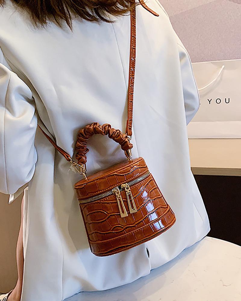 Croc Embossed Zip Ruched Bucket Bag, Brown