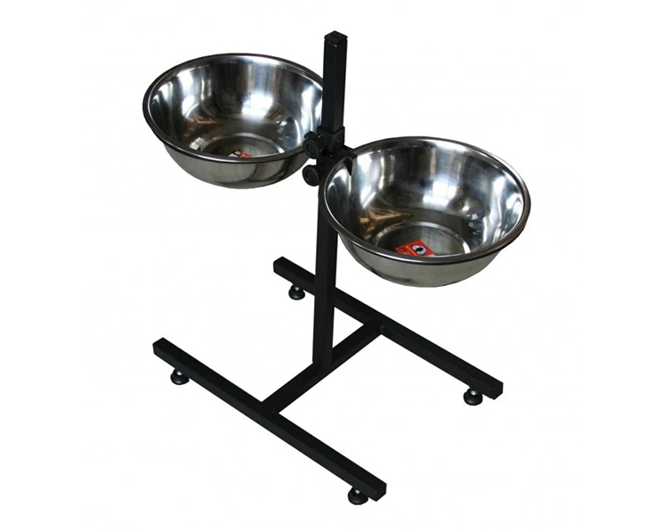 В комплекте 2 нержавеющих миски и чёрная металлическая подставка .