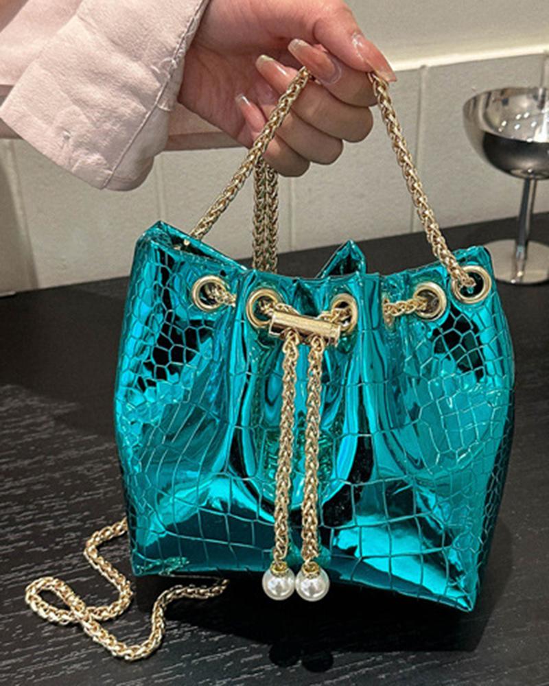 Crocodile Chain Drawstring Bucket Bag, Blue