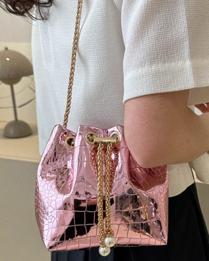 Crocodile Chain Drawstring Bucket Bag, Pink