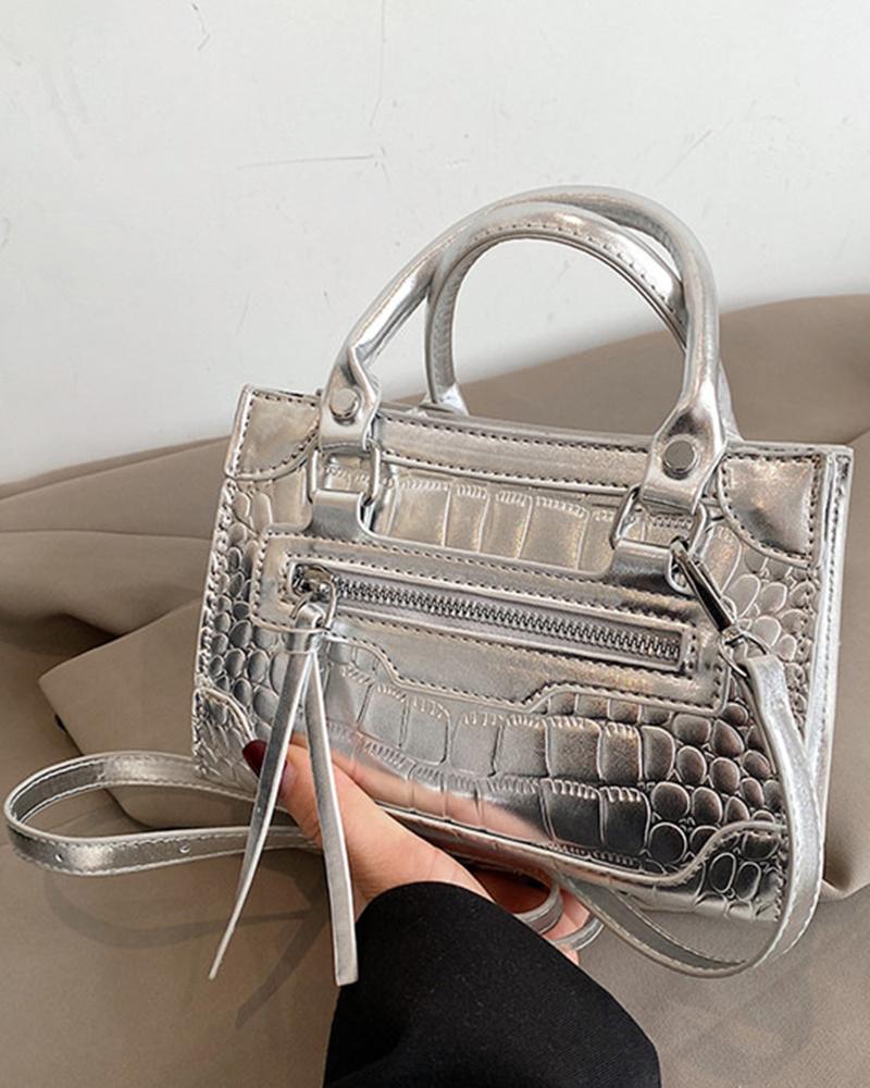 Crocodile Pattern Zipper Design Crossbody Bag, Silver