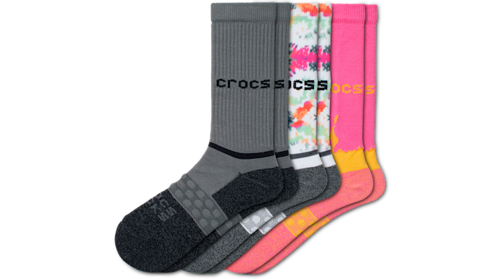 Be comfortable anywhere and everywhere in your own shoes—and now in your own Crocs Socks. Each pair has been engineered with high-quality elastic to help socks stay up, twisted and compacted yarn for improved durability, and a mesh arch band for fit and comfort. Plus, they’re a stylish addition to your everyday look whether you’re lounging or leveling up your favorite outfits. Go wild with this 3-pack by pairing them up or mixing and matching your socks style. 65.3% cotton, 19.3% nylon, 13.2% polyester, 2.2% elastane Machine Wash in 40 C / 104 F Avoid bleaching or ironing, tumble dry low Unique patterns and colors inspired by Crocs Classic shoes and Jibbitz™ Available in crew and quarter heights Includes three matching pairs
