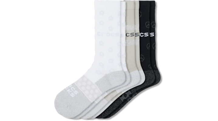 Be comfortable anywhere and everywhere in your own shoes—and now in your own Crocs Socks. Each pair has been engineered with high-quality elastic to help socks stay up, twisted and compacted yarn for improved durability, and a mesh arch band for fit and comfort. Plus, they’re a stylish addition to your everyday look whether you’re lounging or leveling up your favorite outfits. Go wild with this 3-pack by pairing them up or mixing and matching your socks style. Crocs Socks Adult Crew Cyber Shine 3 Pack Details: 65.3% cotton, 19.3% nylon, 13.2% polyester, 2.2% elastane Machine Wash in 40 C / 104 F Do not bleach or iron. Tumble dry on low Unique patterns and colors inspired by Crocs Classic shoes and Jibbitz™ charms Available in crew height Includes three matching pairs