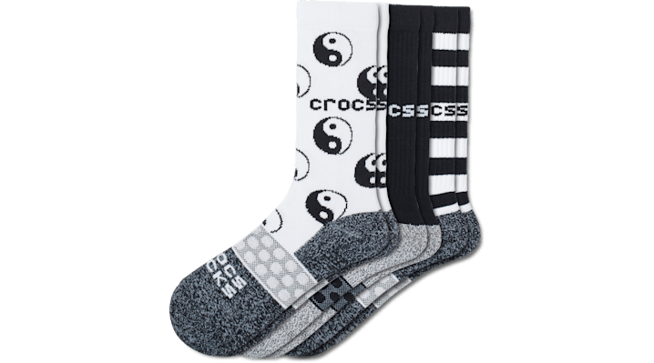 Be comfortable anywhere and everywhere in your own shoes—and now in your own Crocs Socks. Each pair has been engineered with high-quality elastic to help socks stay up, twisted and compacted yarn for improved durability, and a mesh arch band for fit and comfort. Plus, they’re a stylish addition to your everyday look whether you’re lounging or leveling up your favorite outfits. Go wild with this 3-pack by pairing them up or mixing and matching your socks style. Crocs Socks Adult Crew Easy Icon 3-Pack Details: 65.3% cotton, 19.3% nylon, 13.2% polyester, 2.2% elastane Machine Wash in 40 C / 104 F Avoid bleaching or ironing, tumble dry low Unique patterns and colors inspired by Crocs Classic shoes and Jibbitz™ charms Available in a variety of low, crew and quarter heights Includes three matching pairs