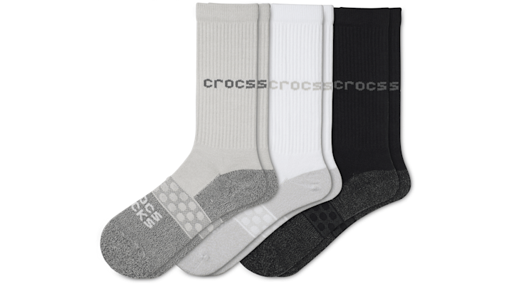 Be comfortable anywhere and everywhere in your own shoes—and now in your own Crocs Socks. Each pair has been engineered with high-quality elastic to help socks stay up, twisted and compacted yarn for improved durability, and a mesh arch band for fit and comfort. Plus, they’re a stylish addition to your everyday look whether you’re lounging or leveling up your favorite outfits. Go wild with this 3-pack by pairing them up or mixing and matching your socks style. Crocs Socks Adult Crew Solid 3-Pack Details: 65.3% cotton, 19.3% nylon, 13.2% polyester, 2.2% elastane Machine Wash in 40 C / 104 F Avoid bleaching or ironing, tumble dry low Unique patterns and colors inspired by Crocs Classic shoes and Jibbitz™ charms Available in a variety of low, crew and quarter heights Includes three matching pairs