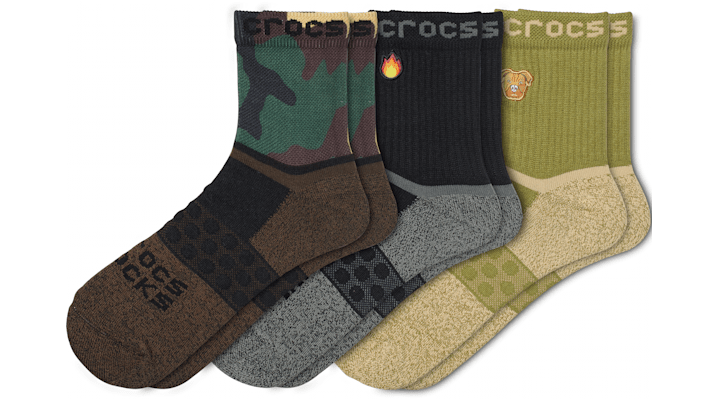 Be comfortable anywhere and everywhere in your own shoes—and now in your own Crocs Socks. Each pair has been engineered with high-quality elastic to help socks stay up, twisted and compacted yarn for improved durability, and a mesh arch band for fit and comfort. Plus, they’re a stylish addition to your everyday look whether you’re lounging or leveling up your favorite outfits. Go wild with this 3-pack by pairing them up or mixing and matching your socks style. Crocs Socks Adult Quarter Graphic 3-Pack Details: 65.3% cotton, 19.3% nylon, 13.2% polyester, 2.2% elastane Machine Wash in 40 C / 104 F Avoid bleaching or ironing, tumble dry low Unique patterns and colors inspired by Crocs Classic shoes and Jibbitz™ charms Available in a variety of low, crew and quarter heights Includes three matching pairs