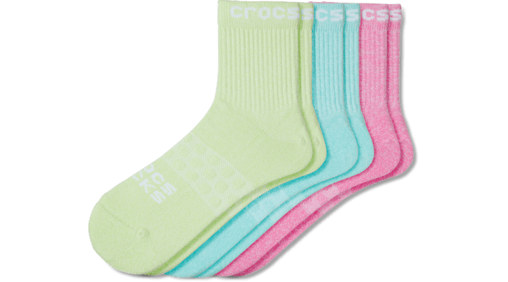 Be comfortable anywhere and everywhere in your own shoes—and now in your own Crocs Socks. Each pair has been engineered with high-quality elastic to help socks stay up, twisted and compacted yarn for improved durability, and a mesh arch band for fit and comfort. Plus, they’re a stylish addition to your everyday look whether you’re lounging or leveling up your favorite outfits. Go wild with this 3-pack by pairing them up or mixing and matching your socks style. Crocs Socks Adult Twisted Yarn Quarter Solid 3-Pack Details: 65.3% cotton, 19.3% nylon, 13.2% polyester, 2.2% elastane Machine Wash in 40 C / 104 F Avoid bleaching or ironing, tumble dry low Unique patterns and colors inspired by Crocs Classic shoes and Jibbitz™ charms Available in a variety of low, crew and quarter heights Includes three matching pairs