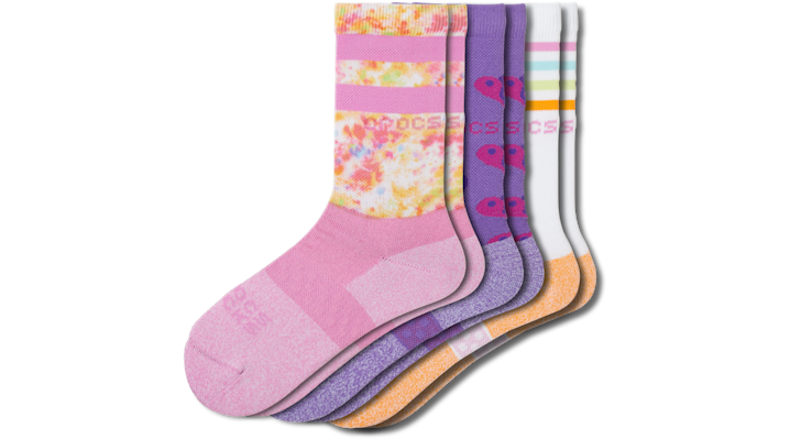 Be comfortable anywhere and everywhere in your own shoes—and now in your own Crocs Socks. Each pair has been engineered with high-quality elastic to help socks stay up, twisted and compacted yarn for improved durability, and a mesh arch band for fit and comfort. Plus, they’re a stylish addition to your everyday look whether you’re lounging or leveling up your favorite outfits. Go wild with this 3-pack by pairing them up or mixing and matching your socks style. Crocs Socks Kid Crew Heart 3-Pack Details: 65.3% cotton, 19.3% nylon, 13.2% polyester, 2.2% elastane Machine Wash in 40 C / 104 F Avoid bleaching or ironing, tumble dry low Unique patterns and colors inspired by Crocs Classic shoes and Jibbitz™ charms Available in a variety of low, crew and quarter heights Includes three matching pairs