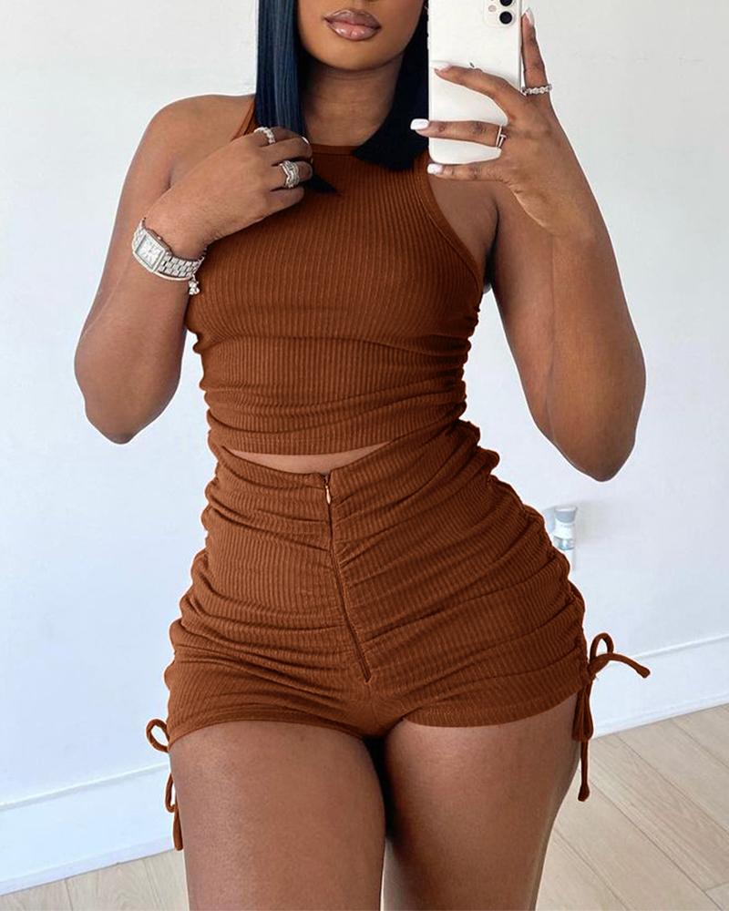Crop Tank Top & Drawstring Ruched Zipper Fly Shorts Set, Coffee