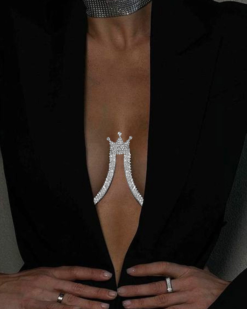 Crown Pattern Rhinestone Curved Body Chain, Silver