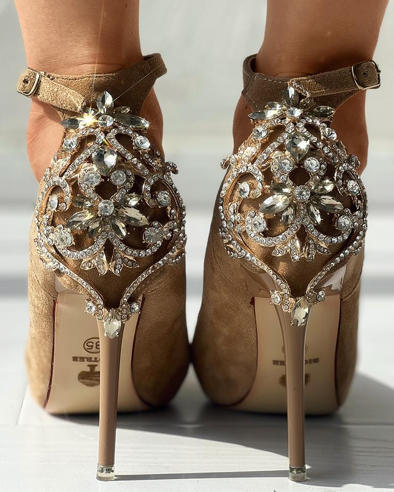 Crystal Rhinestone Ankle Strap Stiletto Heel Pumps, Khaki