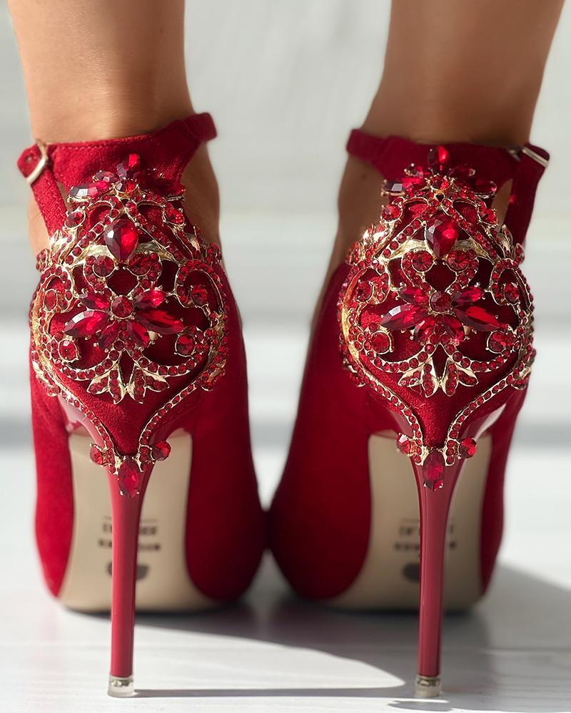 Crystal Rhinestone Ankle Strap Stiletto Heel Pumps, Red