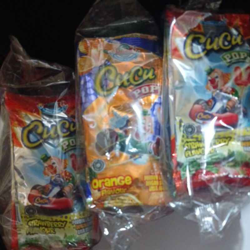 permen lolipop dengan serbuk rasa buah stroberi dan jeruk isi 20 bks/pak