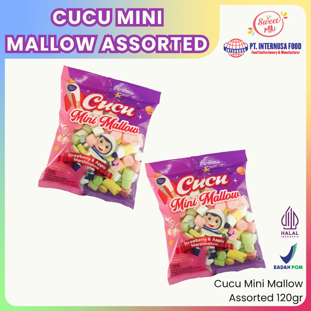 Nikmati keseruan camilan dengan Cucu Mini Mallow Assorted! Permen mini kenyal dengan berbagai rasa buah segar seperti stroberi, anggur, jeruk, dan lainnya siap memanjakan lidah Anda. Tekstur lembut dan kenyal membuat permen ini disukai semua usia, dari anak-anak hingga dewasa. Kemasan 120gr yang praktis dan menarik cocok untuk camilan sehari-hari, acara spesial, atau suguhan tamu. Bentuk mini yang lucu membuatnya makin menarik untuk dicicipi!