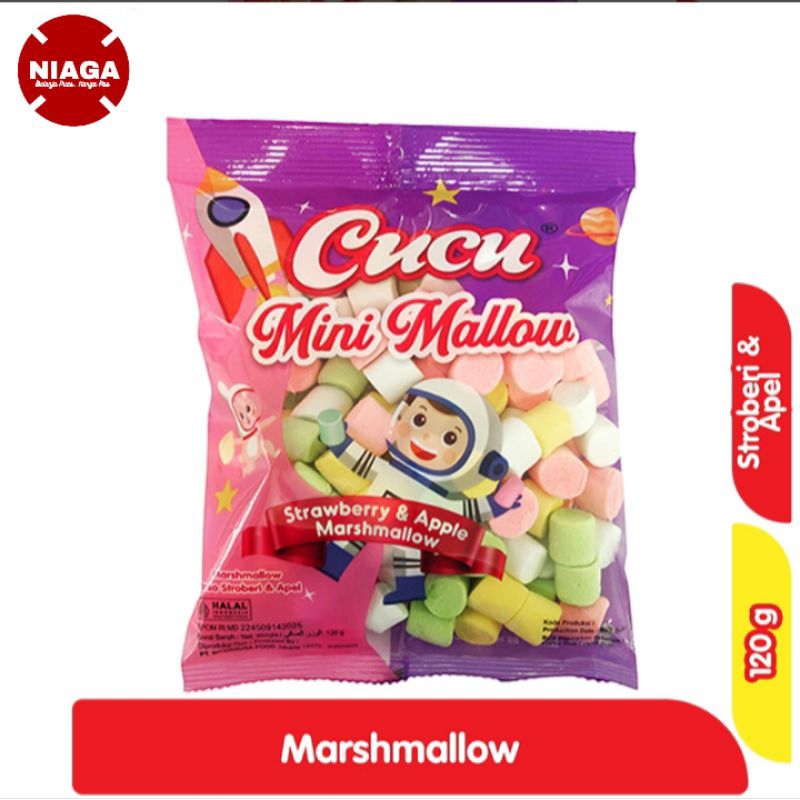 Cucu Mini Mallow Marshmallow Rasa Stroberi & Apel 120 g adalah camilan marshmallow