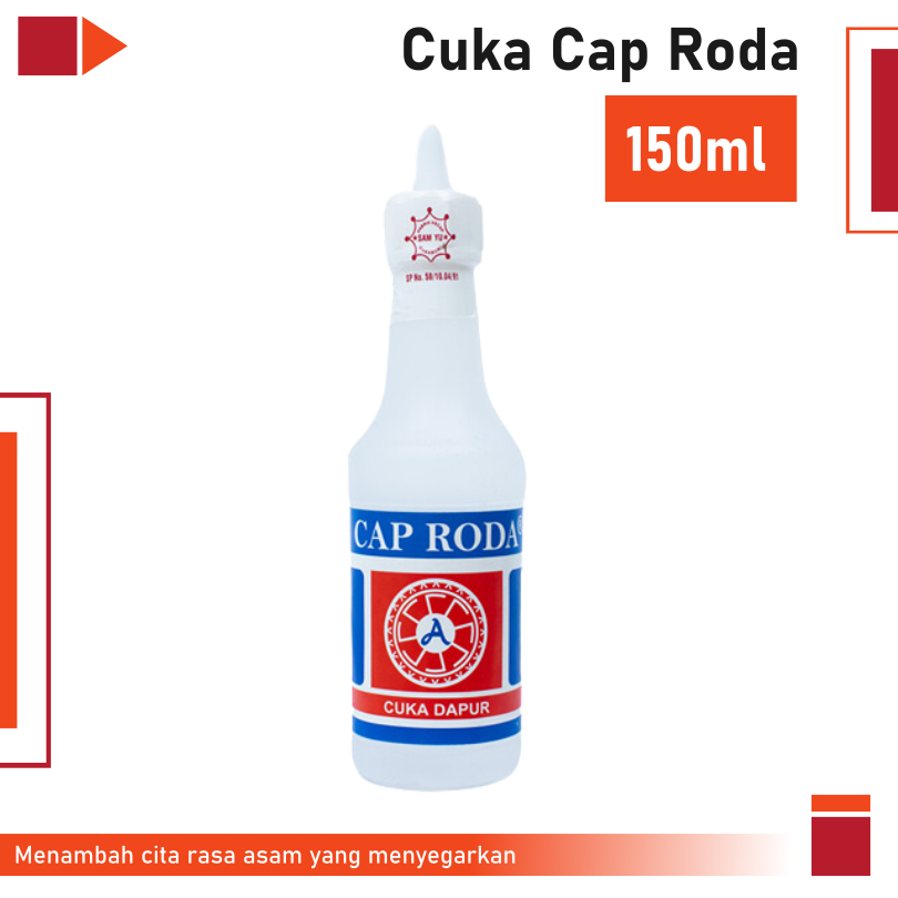 Cuka Cap Roda adalah cuka berkualitas tinggi yang terbuat dari bahan pilihan. Dengan rasa asam yang segar, Cuka Cap Roda cocok digunakan sebagai bahan tambahan untuk hidangan seperti bakso, acar, asinan, dan Lainnya.