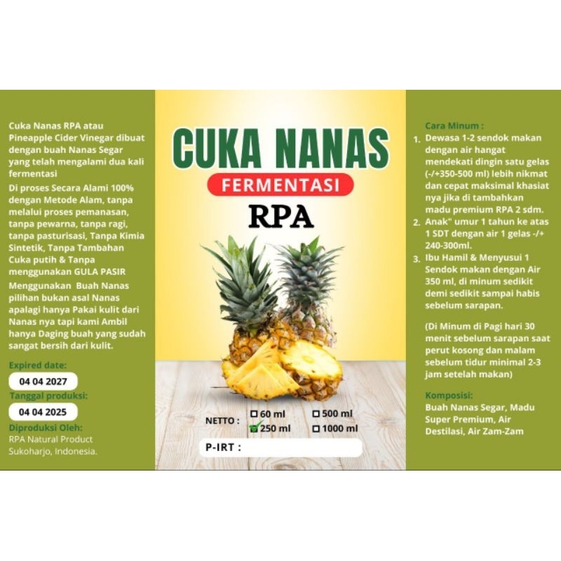 Cuka Nanas fermentasi dari RPA siap di daftarkan legalitas nya kemudian di pasar kan untuk memberikan varian rasa pada pelanggan setia Cuka apelRPA dan pada saat bukan musim Apel sesuai RPA gunakan.