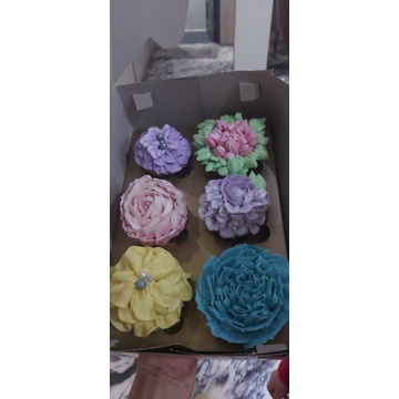 1 box isi 6 cupcake cantik. Buttercreamnya tidak bikin enek, tidak terlalu manis. Untuk same day, pengiriman dilakukan keesokan harinya, made by order.