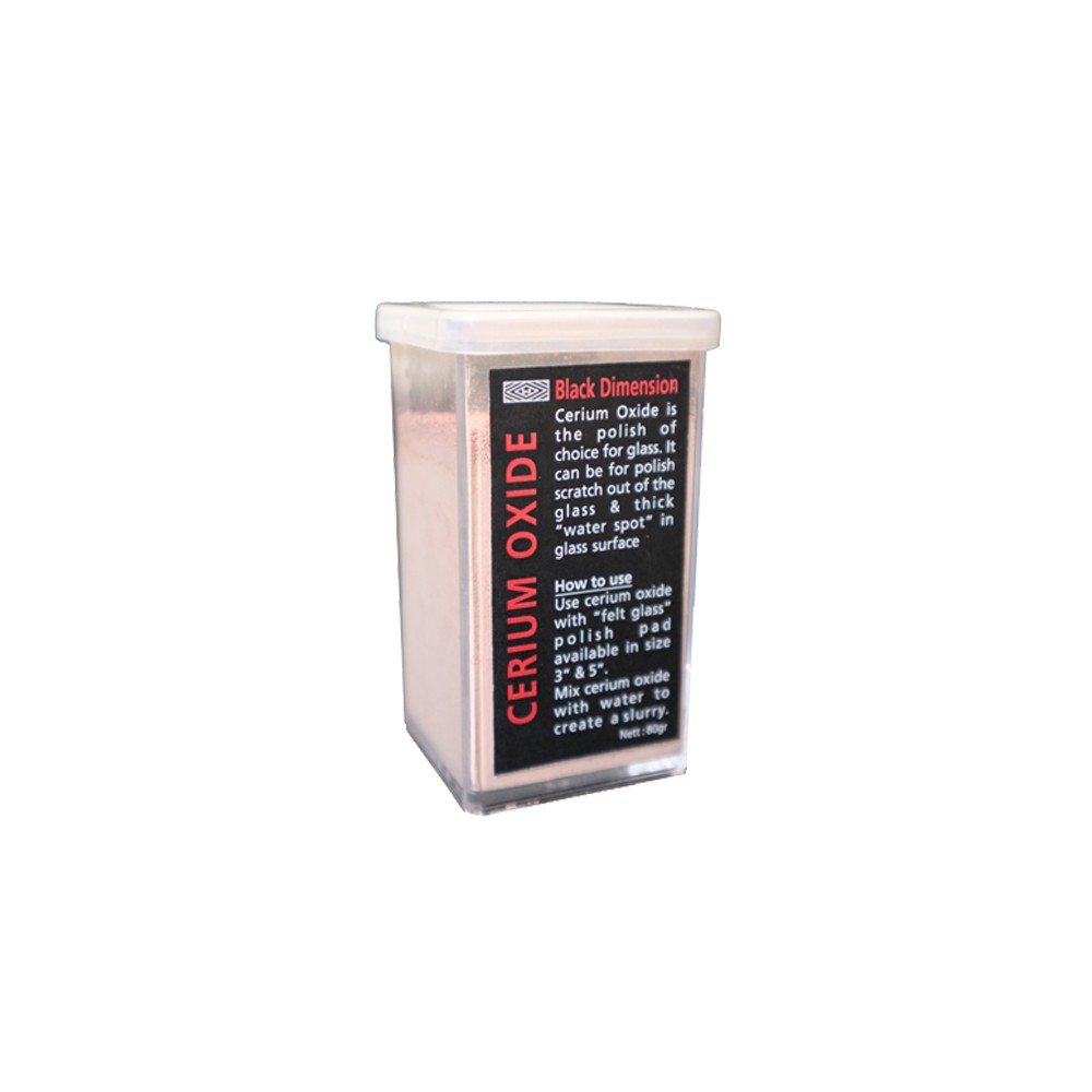 Bubuk cerium oxide ini juga digunakan untuk memoles permukaaan kaca yg baret dgn bantuan felt glass disc poles dan mesin poles rotary