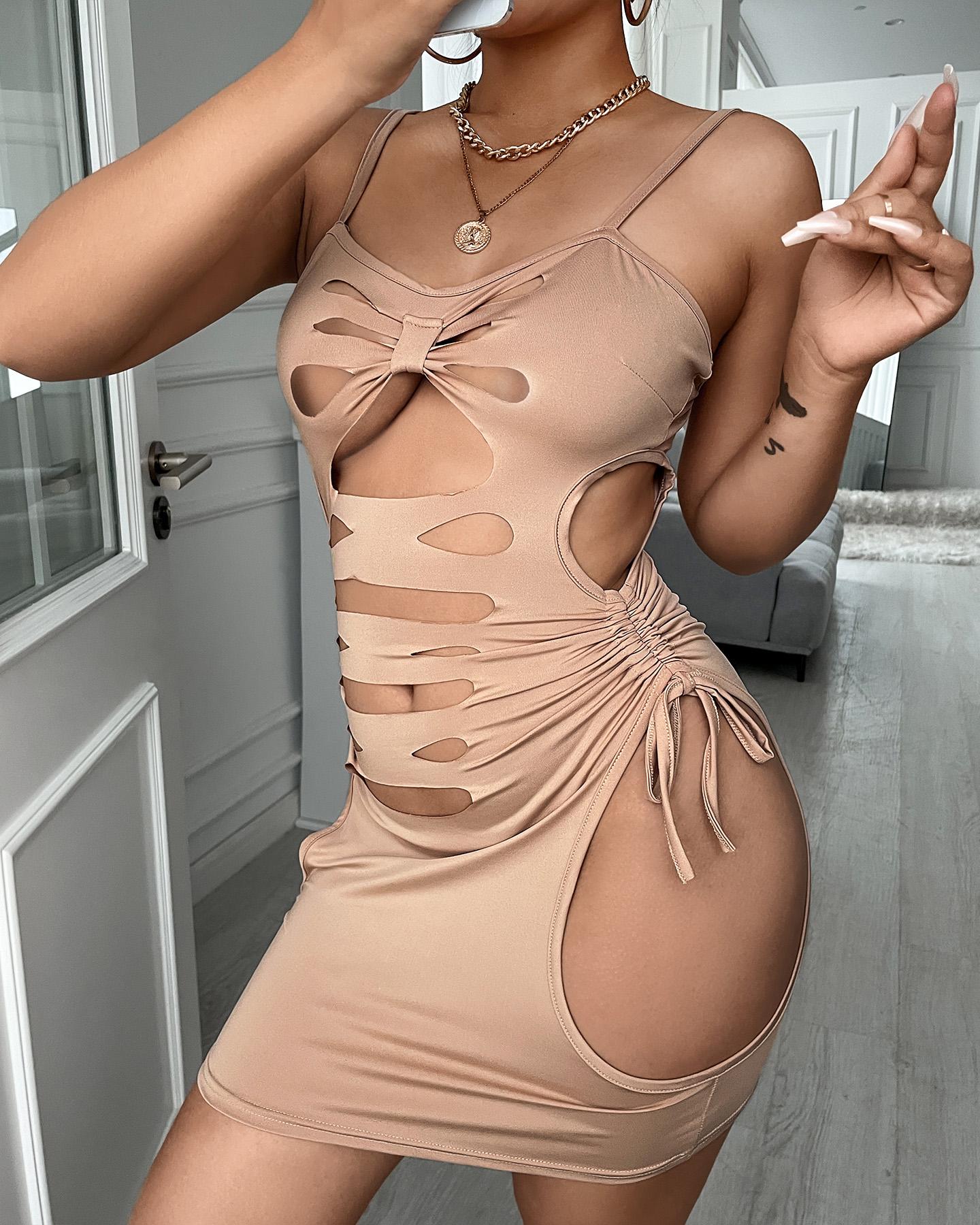 Cut-Out Drawstring Ruched Bodycon Cami Dress, Brown