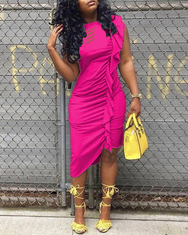 Cut Out Ruffles Ruched Irregular Bodycon Dress, Hot pink