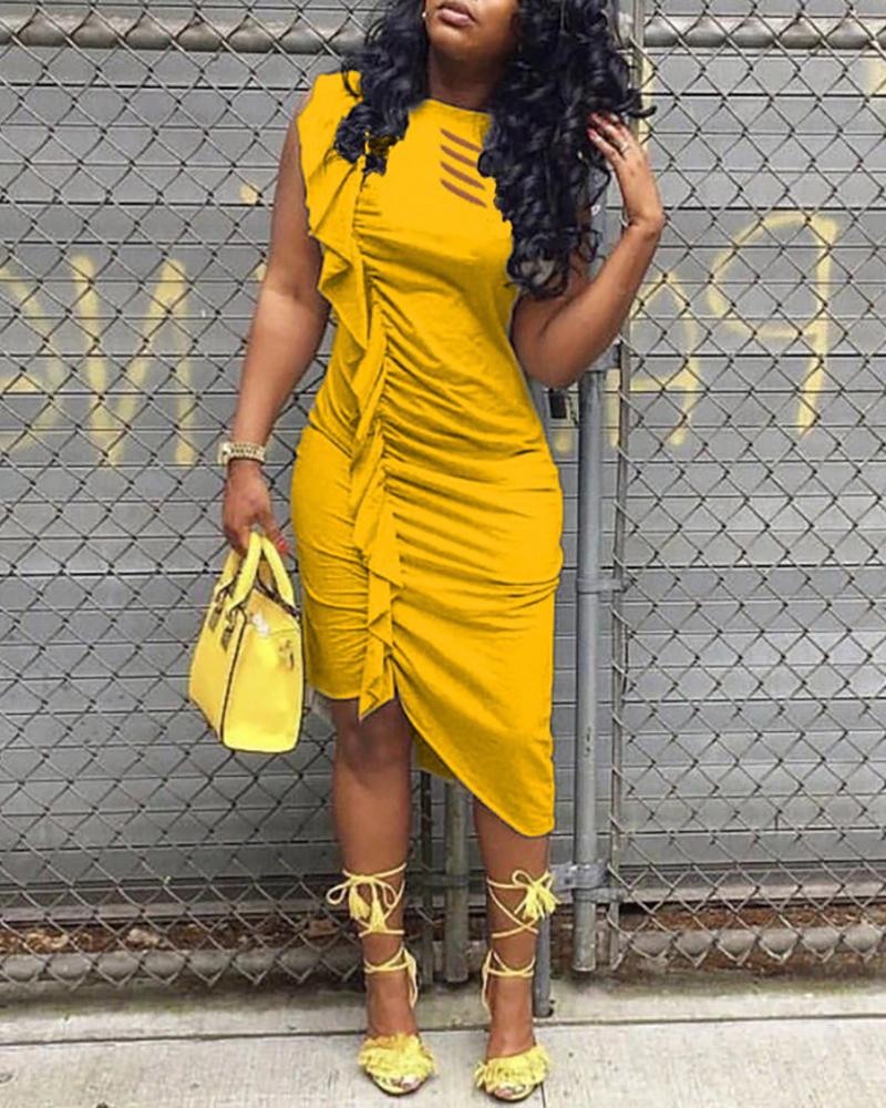 Cut Out Ruffles Ruched Irregular Bodycon Dress, Yellow