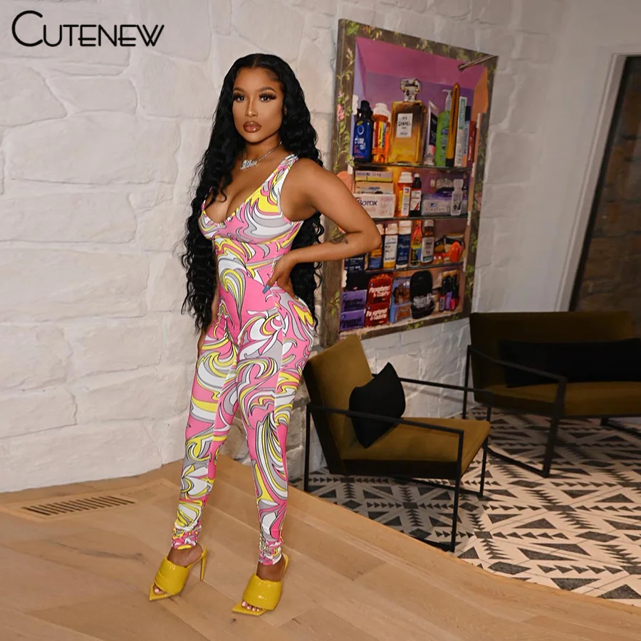 Cutenew принт панельные комбинезон для женщин пикантные узкие декольте комбинезон без рукавов с низким вырезом наряд из одного предмета; Женск...