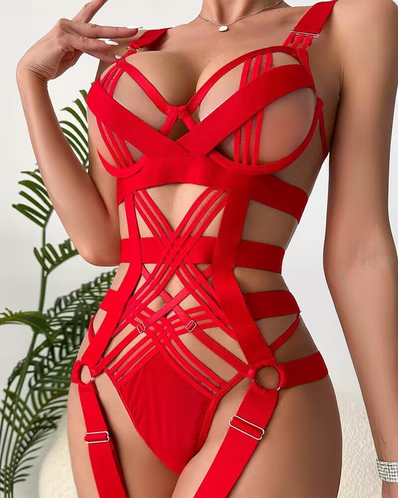 Cutout Backless Garter Lingerie Set, Red