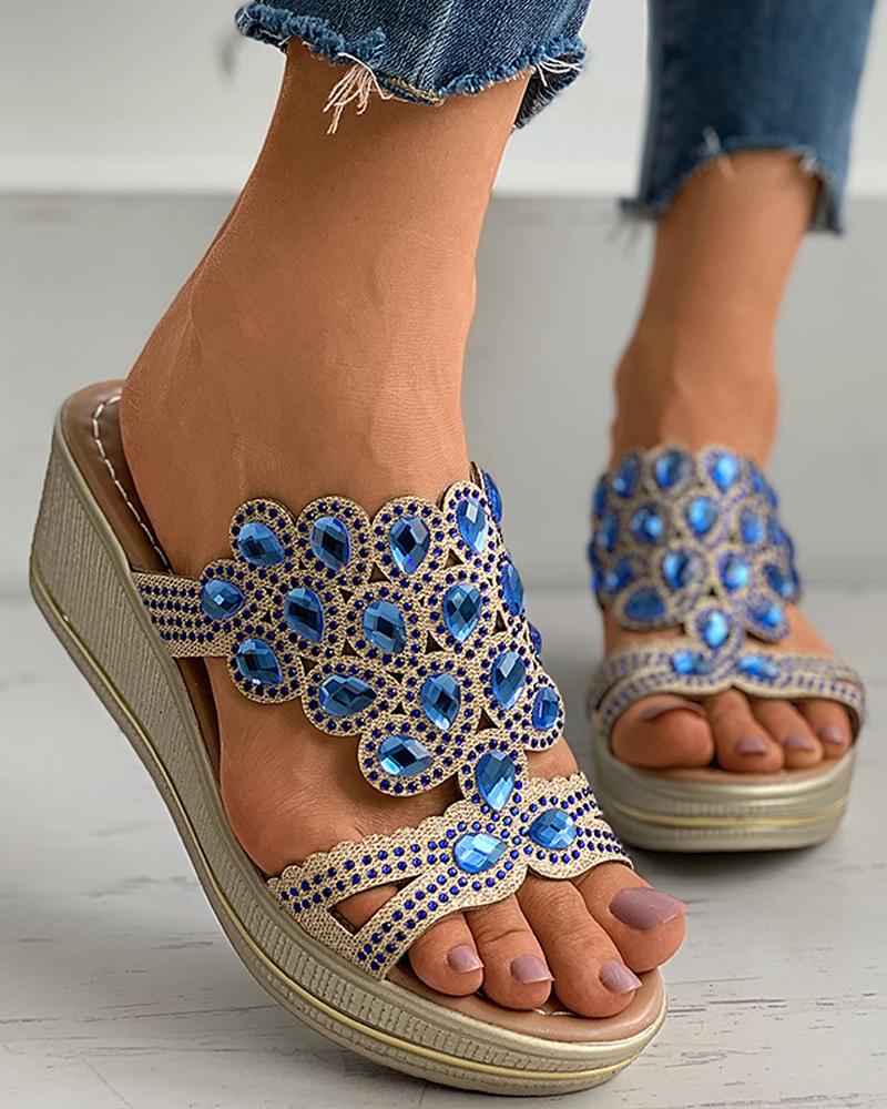 Cutout Rhinestone Peep Toe Wedge Sandals, Blue