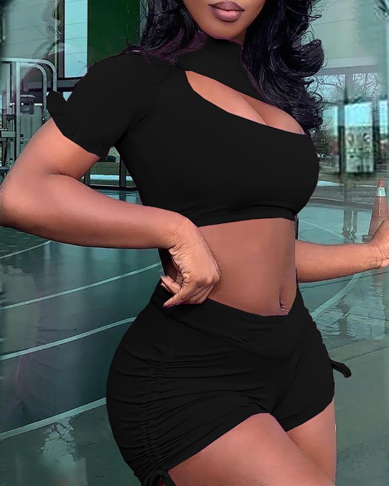 Cutout Ruffles Crop Top & Ruched Drawstring Shorts Set, Black