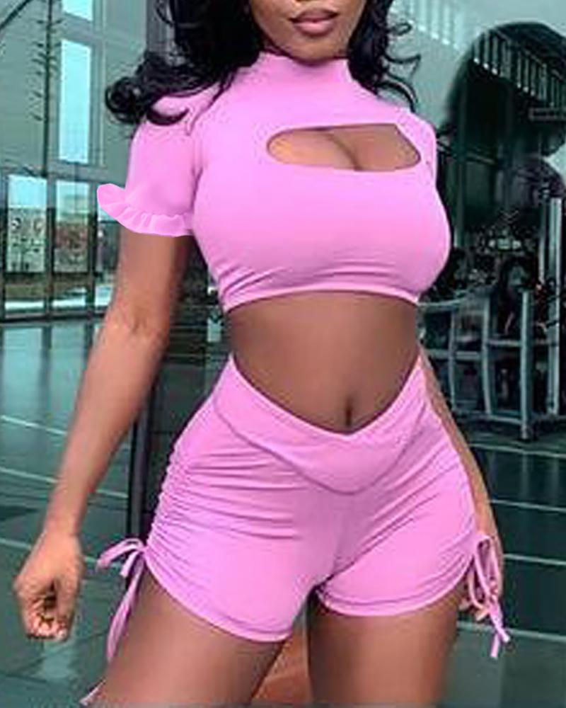 Cutout Ruffles Crop Top & Ruched Drawstring Shorts Set, Pink