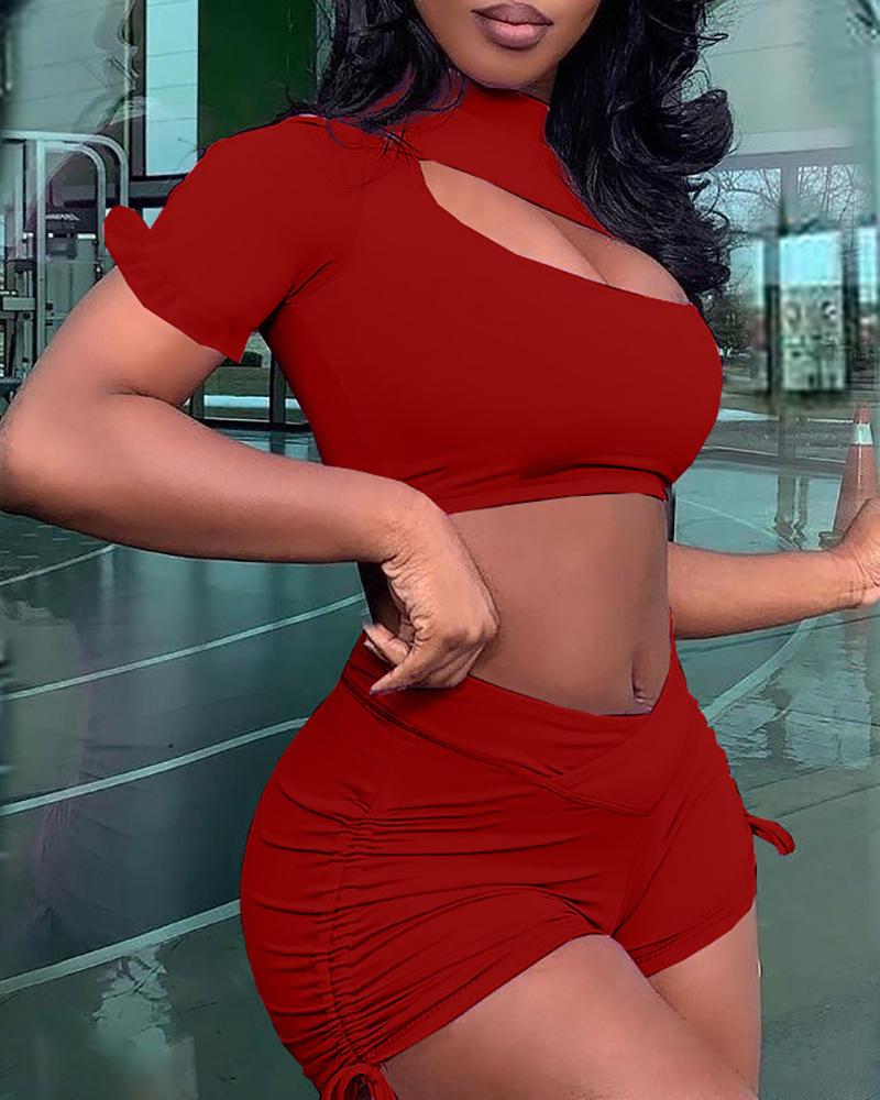 Cutout Ruffles Crop Top & Ruched Drawstring Shorts Set, Wine red
