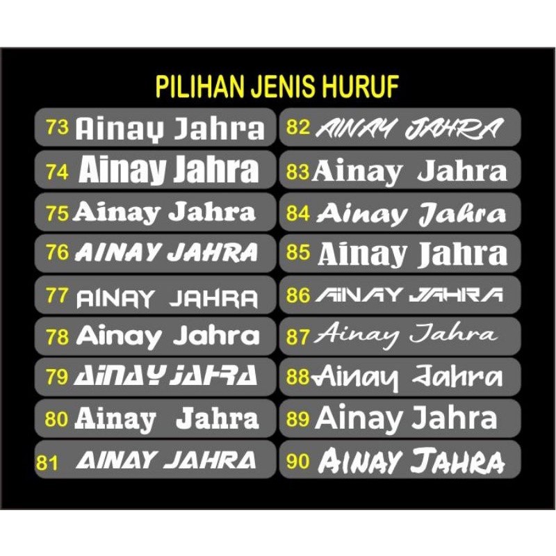 -Silahkan Chat kami Untuk PEMESANAN dan Pilihan Font ( model Tulisan ) Ada Pada gambar Atau TULIS DIKOLOM PESANAN SAAT CHECK OUT NAMA DAN NOMOR FONT YANG KALIAN INGIN KAN