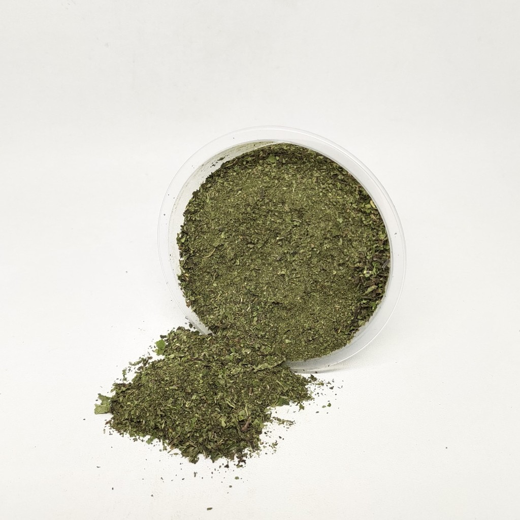 * Berat bersih: ± 40 gram* Bentuk: Daun mint kering (remukan)* Warna: Hijau alami* Aroma: Segar dan khas mint* Digunakan untuk: Minuman herbal, teh mint, infused water, garnish, masakan, dan keperluan kesehatan tradisional